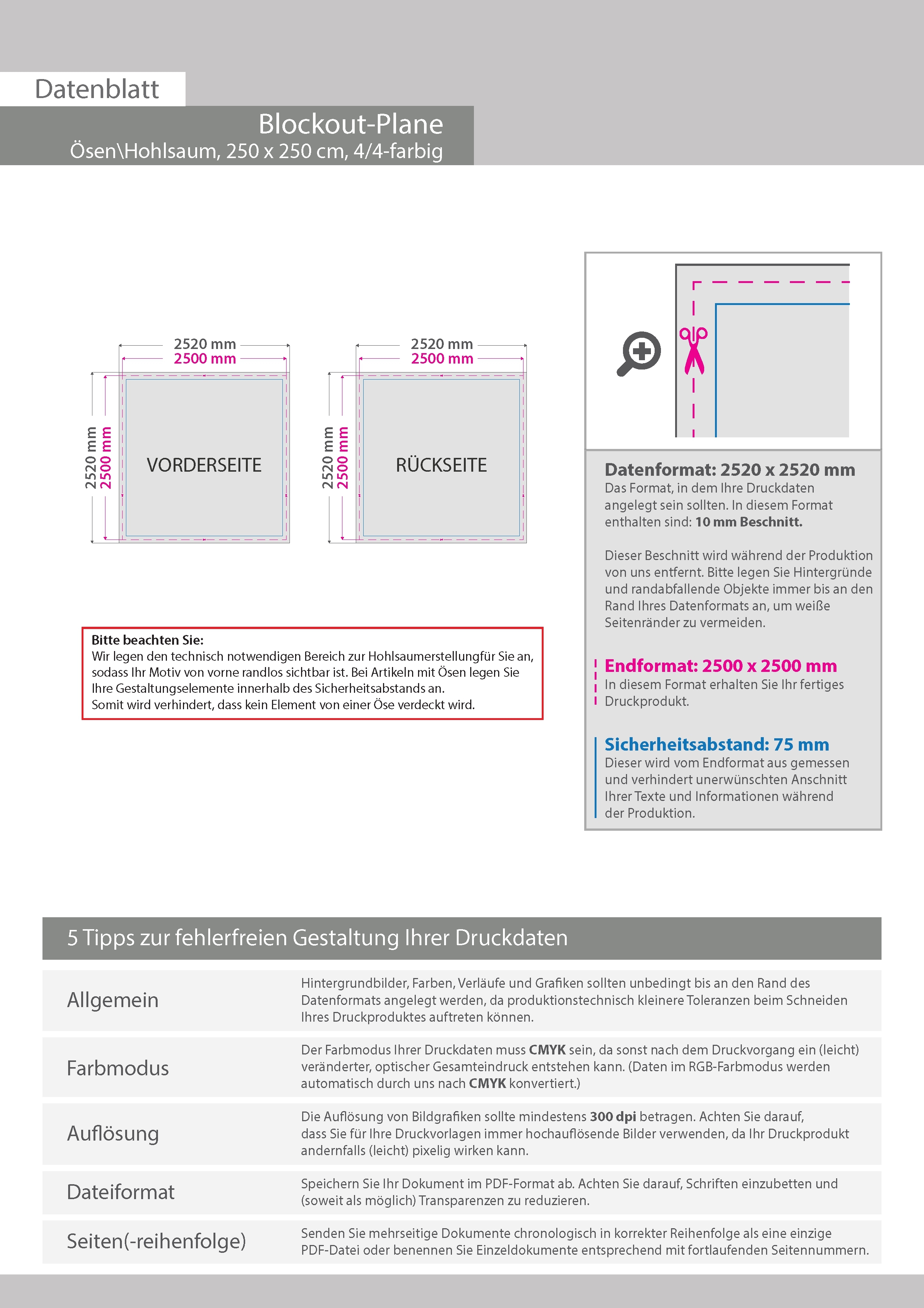 Hochwertige Blockout-Plane 250 x 250 cm, 4/4-farbig bedruckt, Ösen im Abstand von 50 cm rundum