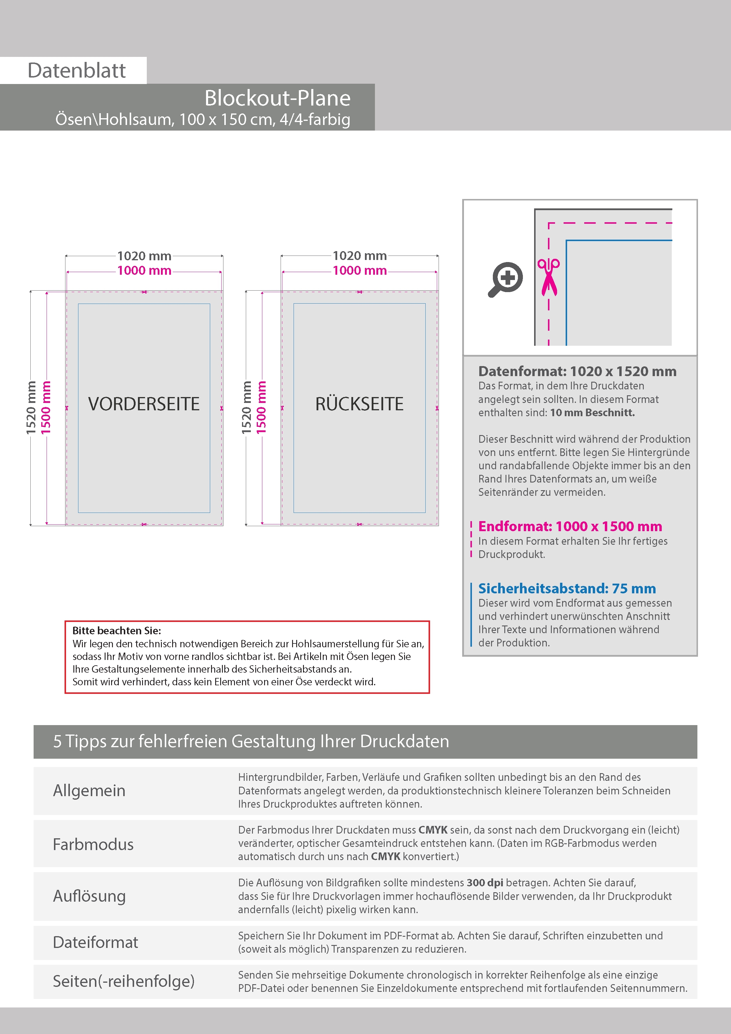 Hochwertige Blockout-Plane 100 x 150 cm, 4/4-farbig bedruckt, Hohlsaum links und rechts (Durchmesser Hohlsaum 3,0 cm)