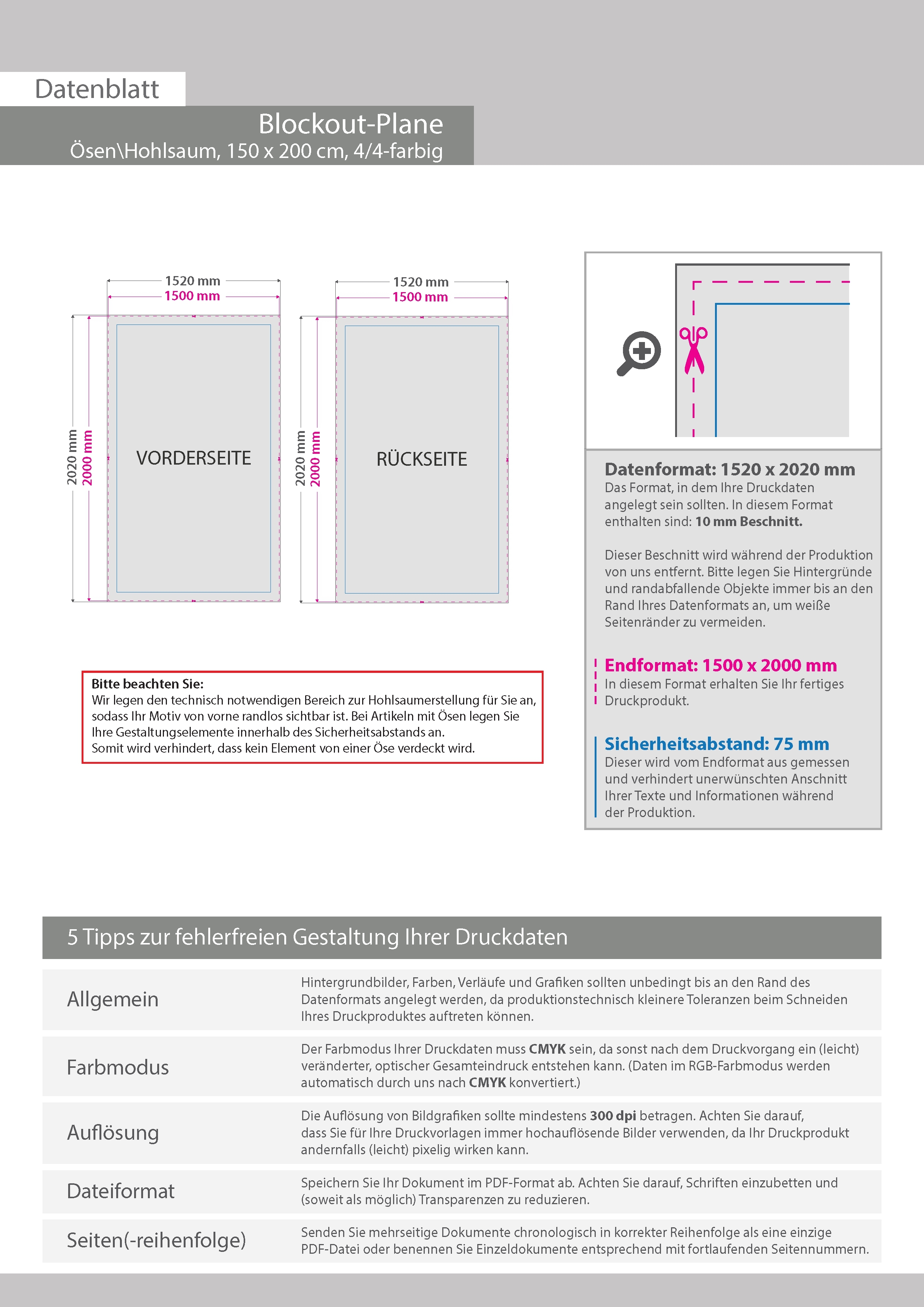 Hochwertige Blockout-Plane 150 x 200 cm, 4/4-farbig bedruckt, Hohlsaum links und rechts (Durchmesser Hohlsaum 6,0 cm)