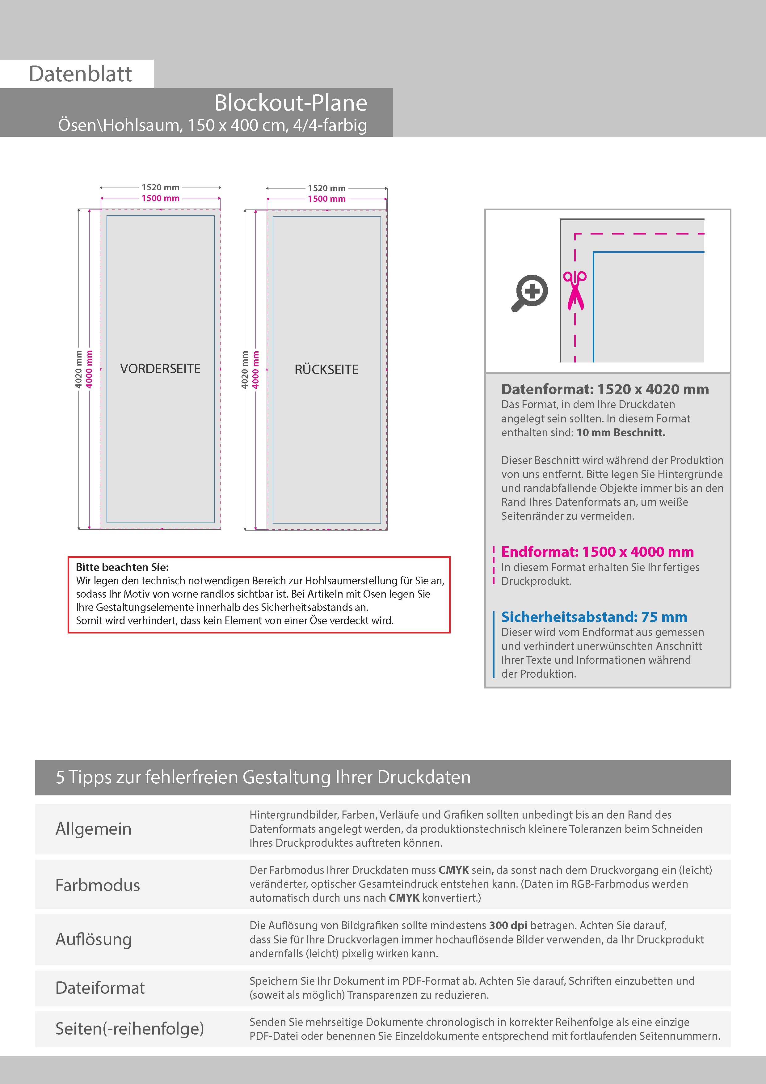 Hochwertige Blockout-Plane 150 x 400 cm, 4/4-farbig bedruckt, Hohlsaum oben und unten (Durchmesser Hohlsaum 6,0 cm)