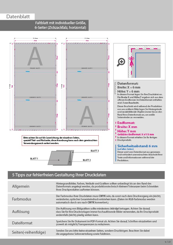 Faltblatt mit individueller Größe, 6-Seiter (Zickzackfalz), Falzung an der horizontalen Seite
